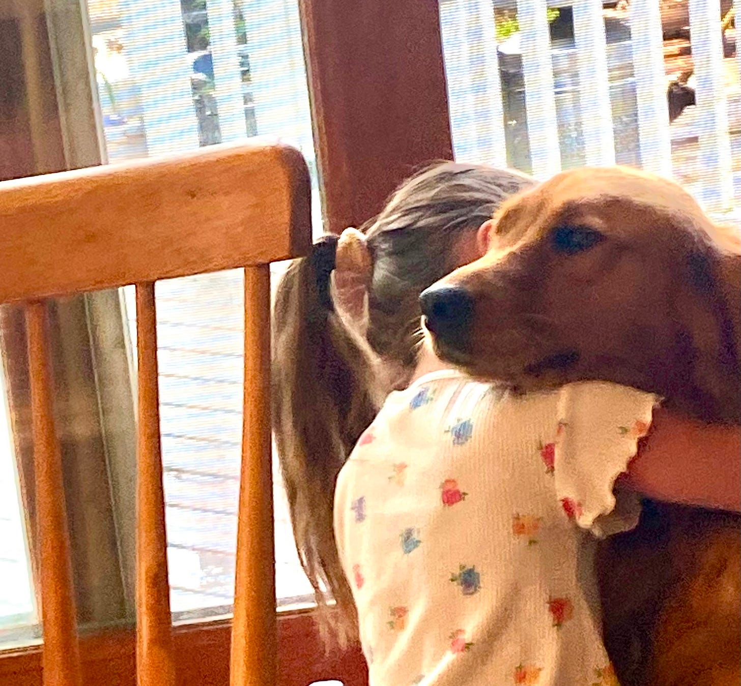 I could be annoyed. But I am resigned. We’ve had both dogs for four years now, and no matter what stupid thing Bella does, I cannot help but appreciate how she openly adores our granddaughters and manages to get a grip on her excitement to avoid jostling them.
