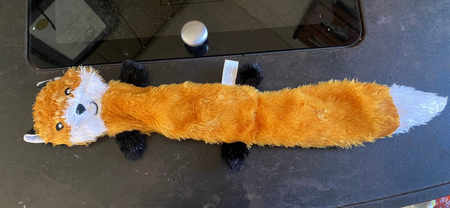 Pete decided that the pooches needed toys for Christmas. He got a long toy that the dogs could chew, and maybe use to play tug-of-war. What could go wrong? He gave the foot-long toy to Bella, who did a zoomie in triumph, and promptly ATE IT. The entire thing. Without so much as a burp. Zoey didn’t even have a chance to give the toy a lick. Doggie Dad raced Bella to our vet. Two hours and $500 later, Bella expelled the toy.
